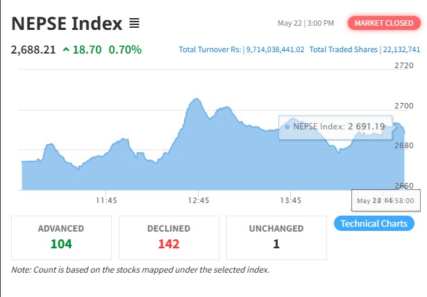साताको अन्तिम दिन नेप्से इन्डेक्स १८।७० अंकले बढेर २६८८।२१ को विन्दुमा कायम भएको छ। सूचीकृत ३१४ कम्पनीको २ करोड २१ लाख कित्ता शेयर खरिदबिक्रि हुँदा ९ अर्ब ७१ करोडको शेयर कारोबार भएको छ ।