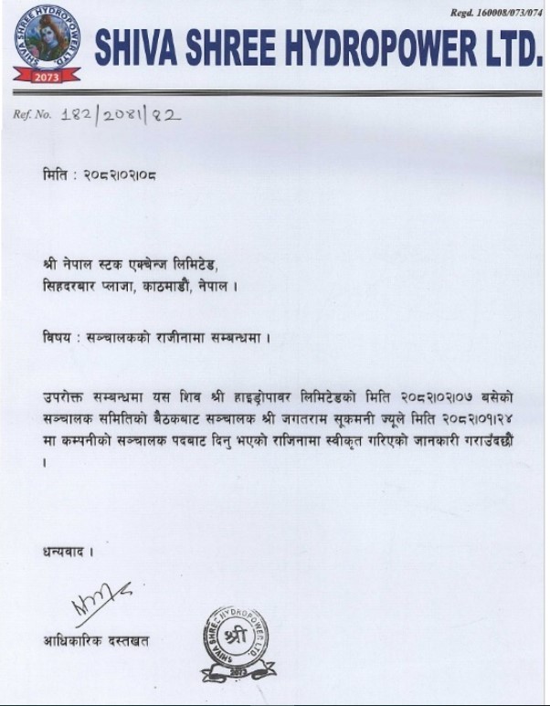 काठमाडौं । शिव श्री हाइड्रोपावर लिमिटेडका सञ्चालक जगतराम सकूमनीले दिएको राजिनामा स्वीकृत गरेको छ ।