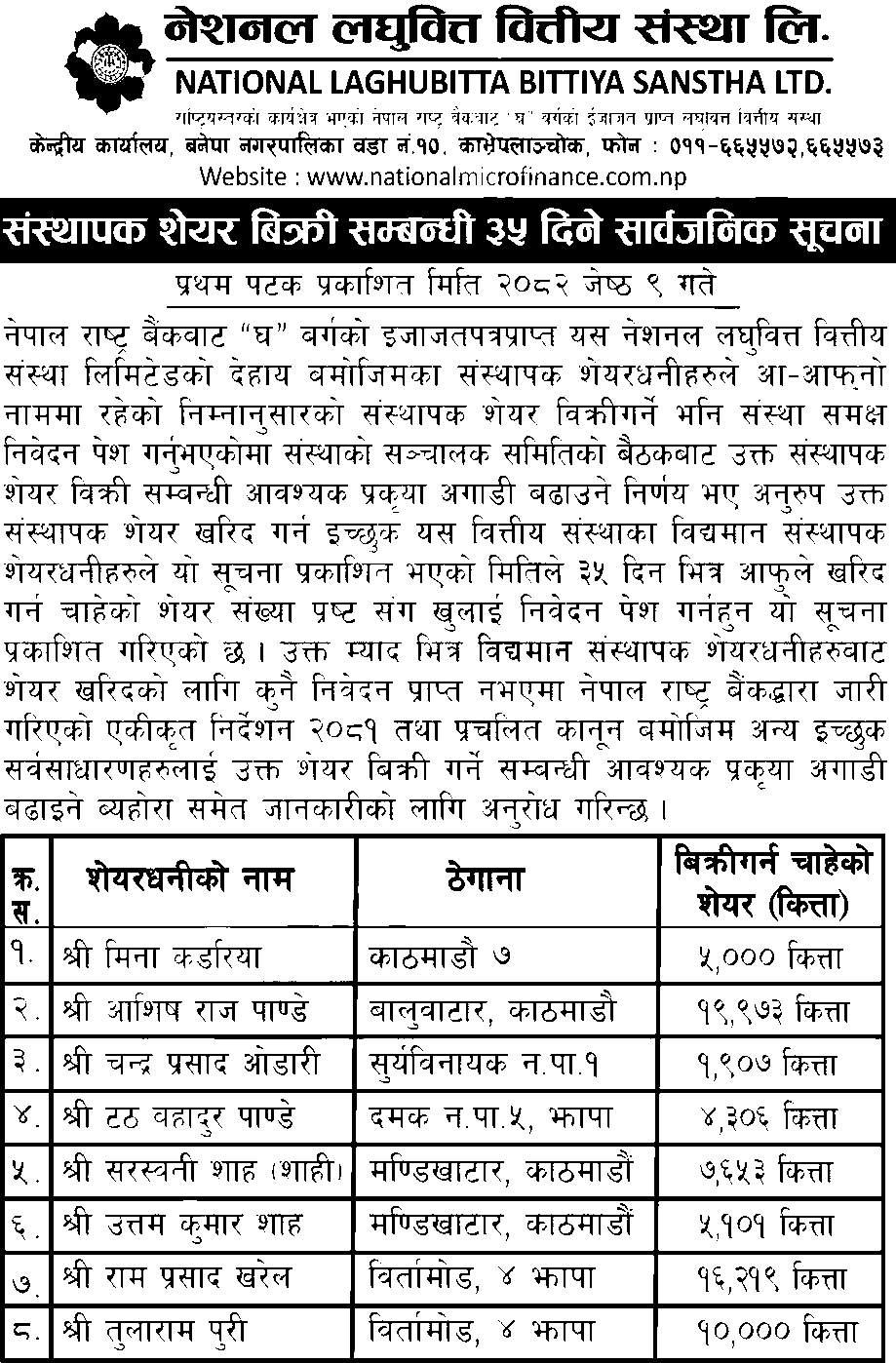 काठमाडौं । नेशनल लघुवित्त वित्तीय संस्था लिमिटेडले ८ जना संस्थापक शेयरधनीहरूको ७० हजार १५९ कित्ता संस्थापक शेयर बिक्रीमा राखेको छ।