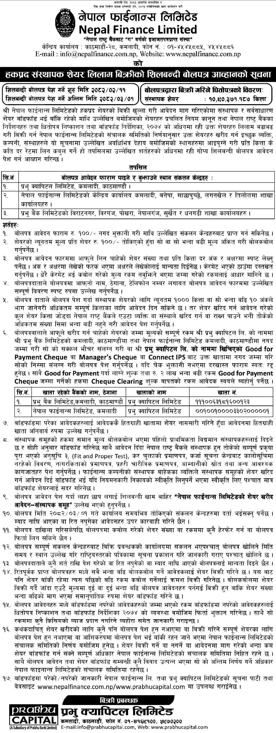 काठमाडौं । नेपाल फाईनान्स लिमिटेडले अवितरित १० लाख ९० हजार ३७१.१८७ कित्ता संस्थापक शेयर सबैले किन्न पाउने गरी लिलाम बिक्रीमा राखेको छ।