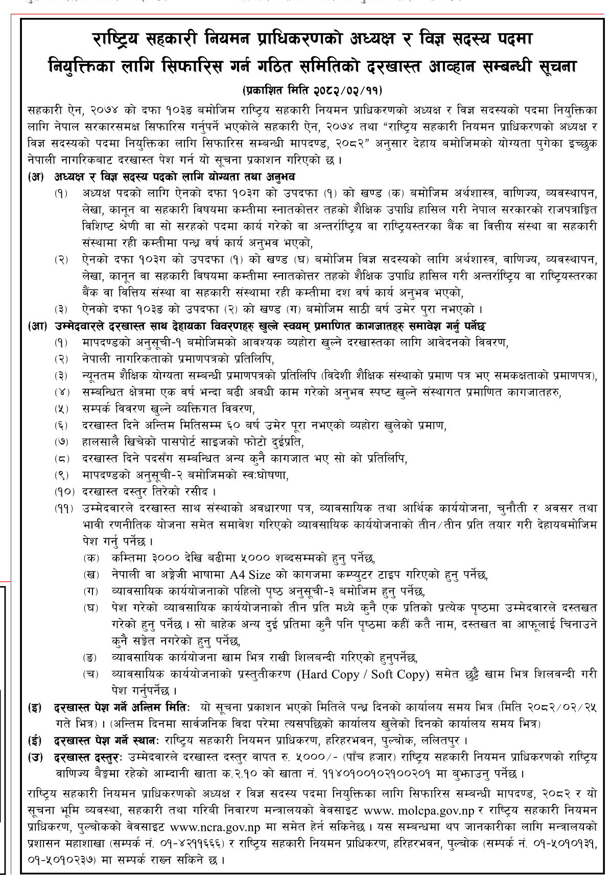 राष्ट्रिय सहकारी नियमन प्राधिकरणको अध्यक्ष र विज्ञ सदस्य पदमा नियुक्तिका लागि आव्हान