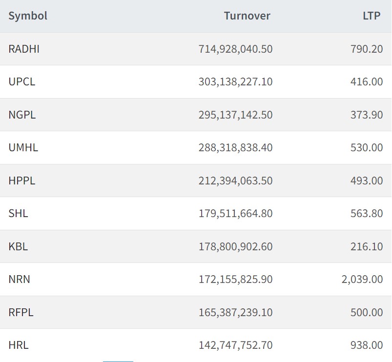 त्यस्तै हिमालयन पावर पार्टनरको २१ करोड २३ लाख रुपैयाँ, सोल्टी होटलको १७ करोड ९५ लाख रुपैयाँ, कुमारी बैंक लिमिटेडको १७ करोड ८८ लाख रुपैयाँ र एनआरएन इन्फ्रास्ट्रक्चरको १७ करोड २१ लाख रुपैयाँको शेयर किनबेच भएको छ।
