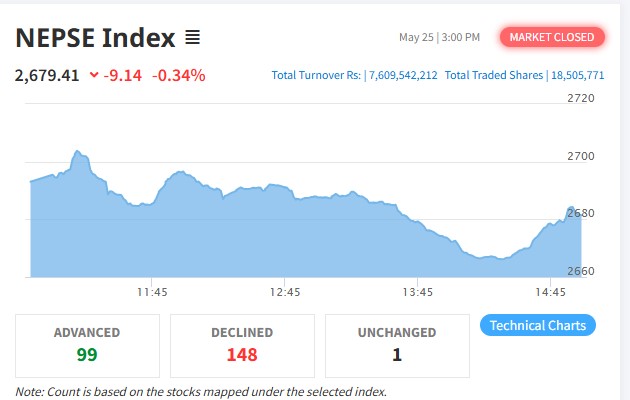 नेप्से इन्डेक्स ९.४२ अंकले घट्यो, कारोबार साढे ७ अर्बमाथि