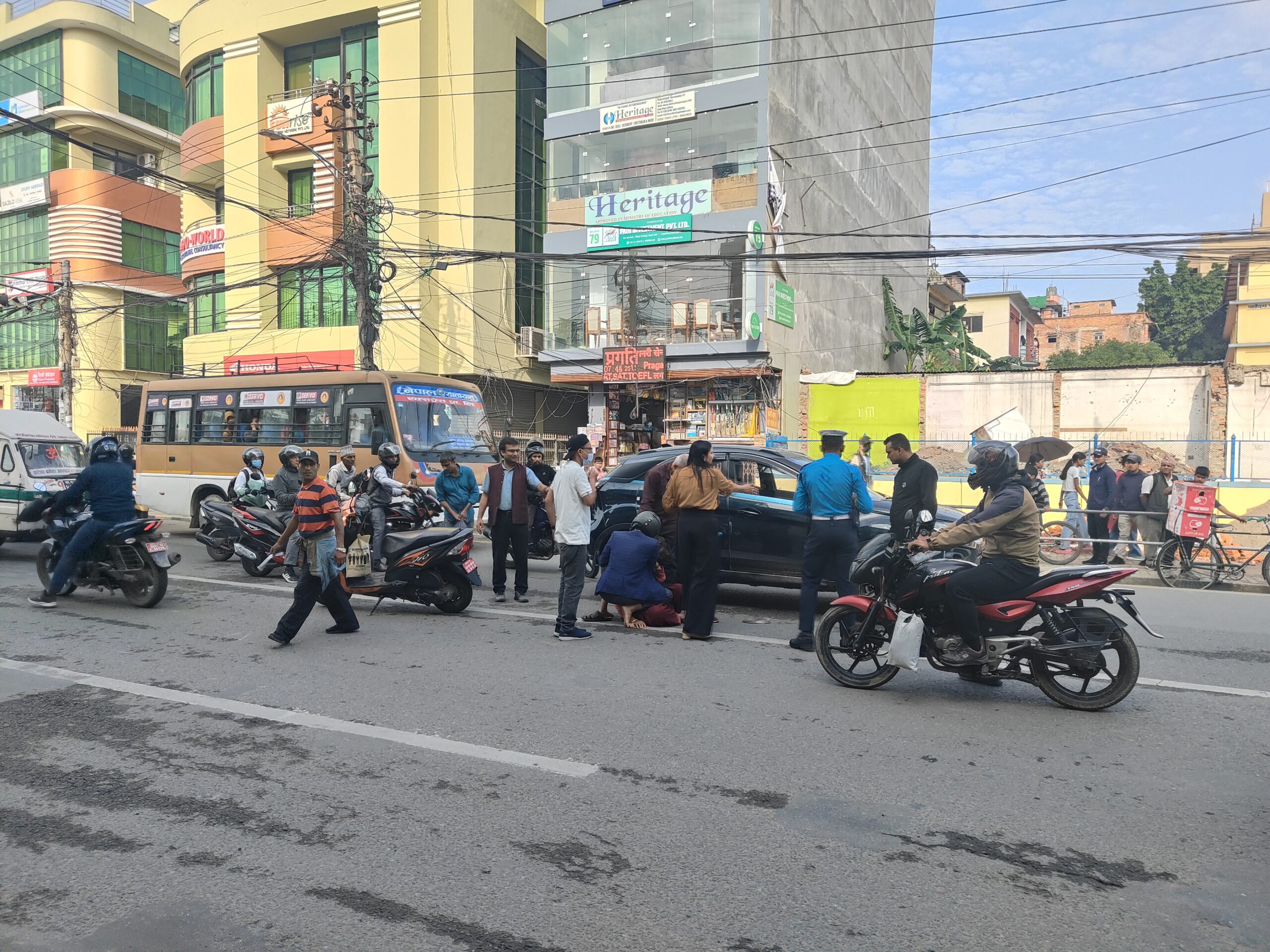 सोमबार बिहानै करीब ७ बजेर ४० मिनेटको समयमा बागबजारबाट माइतीघरतर्फ गइरहेको प्रदेश ३–०२ ००२ प २३६२ नम्बरको स्कुटर विपरीत दिशाबाट आइरहेको प्र. १–०२–००२च ६७३९ नम्बरको कारसँग ठोक्किएको हो।