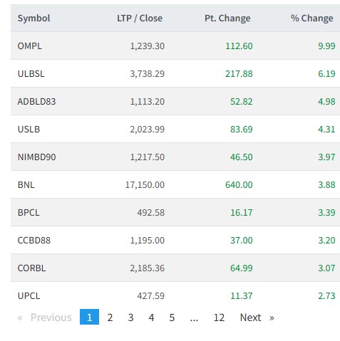 त्यस्तै, उपकार लघुवित्त, कृषि विकास बैेंकको डिभेञ्चर ८३, उन्नती सहकार्य लघुवित्त, एनआइएमबी डिभेञ्चर ९०, बोर्टलर्स नेपाल, सेञ्चुरी डिभेञ्चर ८८, कर्पोरेट डेभलपमेन्ट बैंक र युनिभर्सल पावरको शेयर मूल्य वृद्धि भएको छ ।