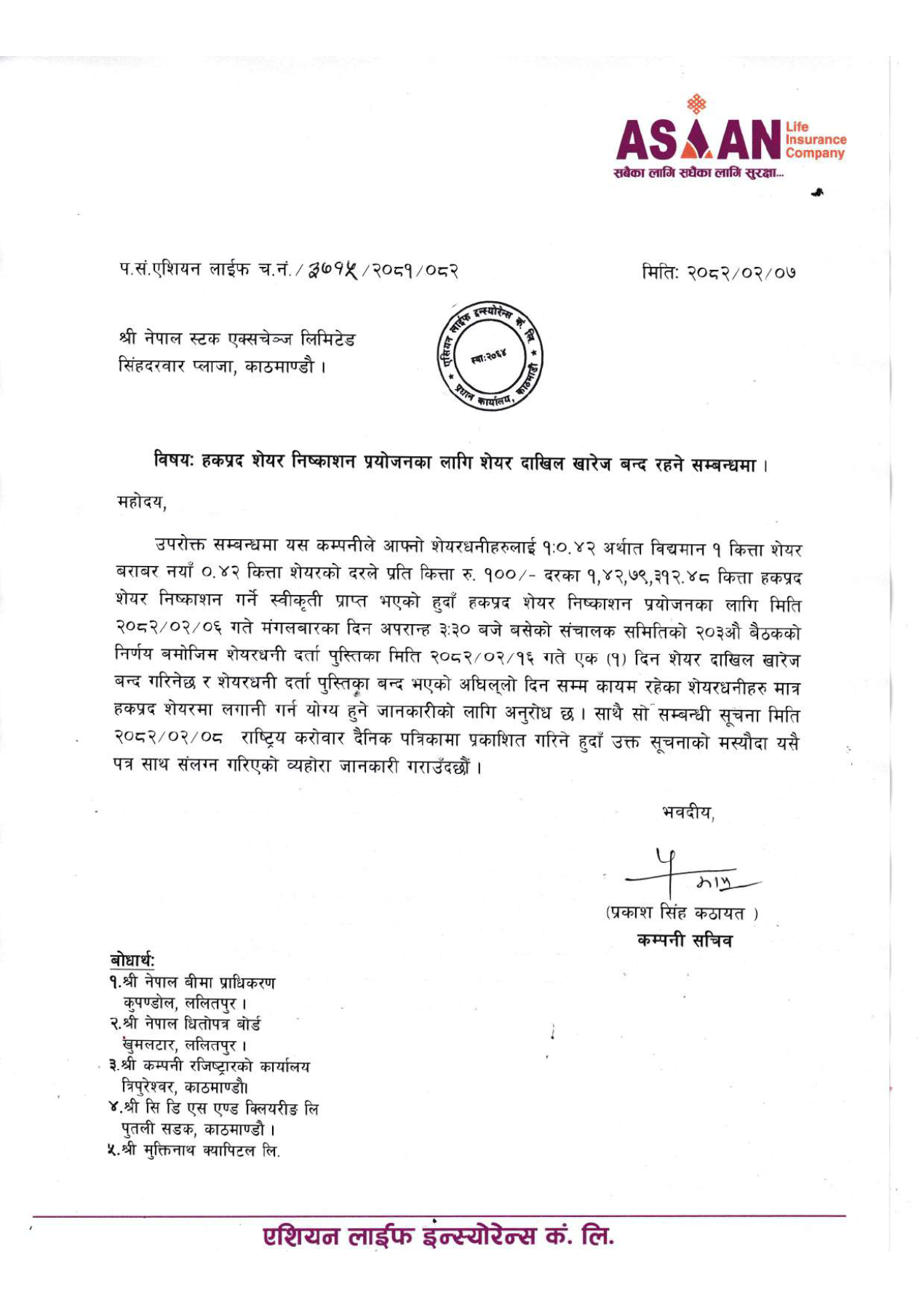 काठमाडौं । एशियन लाइफ इन्स्योरेन्स कम्पनीको ४२ प्रतिशत हकप्रद शेयर सुरक्षित गर्ने आज अन्तिम दिन रहेको छ।