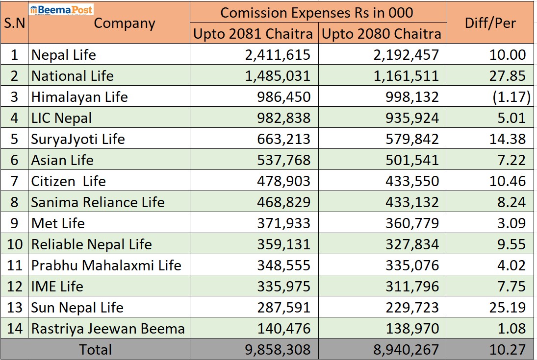 बीमा कम्पनीहरुले प्रकाशन गरेको वित्तीय विवरण अनुसार चैत मसान्तसम्ममा सबैभन्दा धेरै कमिशन भुक्तानी गर्ने कम्पनीमा नेपाल लाइफ इन्स्योरेन्स रहेको छ।