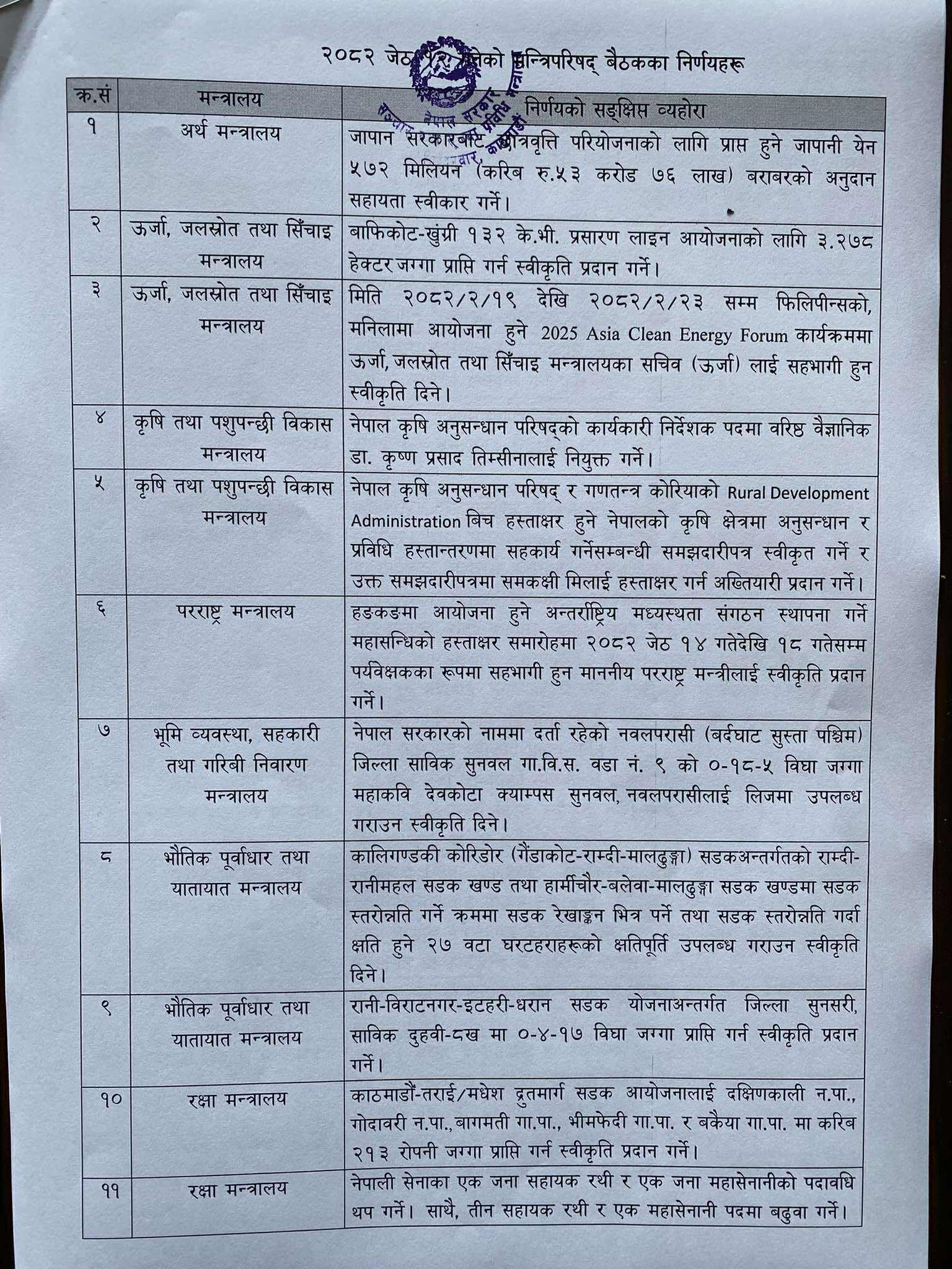 काठमाडौं । मन्त्रिपरिषद् बैठकले २८ निर्णय गरेको छ ।