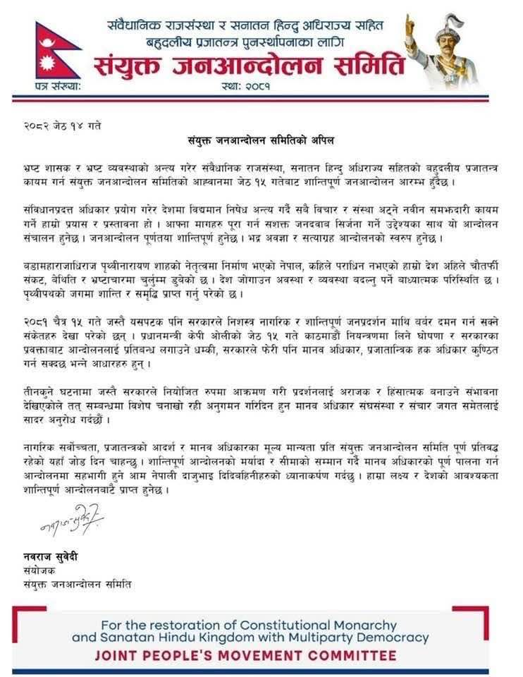 संयुक्त जनआन्दोलन समितिका संयोजक नवराज सुवेदीले अपील जारी गर्दै ‘संविधानप्रदत्त अधिकार प्रयोग गरेर देशमा विद्यमान निषेध अन्त्य गर्दै सबै विचार र संस्था अट्ने नवीन समझदारी कायम गर्ने हाम्रो प्रयास र प्रस्तावना हो।’ भनेका छन्।