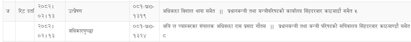 आज सर्वोच्च अदालतका न्यायाधीश मोहम्मद अजिज मुसलमानको इजलासमा अधिवक्ता अनन्त लुईटेल, विशाल थापा समेतको पहिलो मुद्दा रहेको छ भने दोस्रो मुद्दामा अत्रि ल च्याम्बरका राम प्रसाद गौतमले दायर गरेको दोस्रो मुद्दामाथि आजै सुनुवाई हुनेछ । आजै अल्पकालिन अन्तरिम आदेश समेत आउन सक्नेछ ।