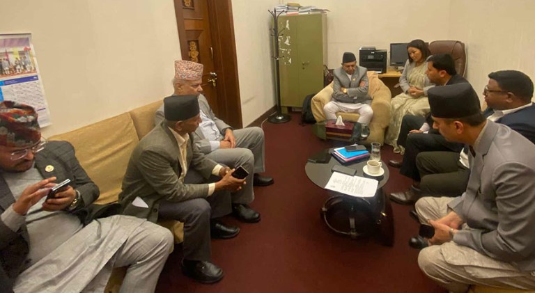 उनको कार्यकक्षमा अहिले सत्ता र प्रतिपक्षी दलका प्रमुख सचेतकहरूसँगको बैठक बसिरहेको छ ।