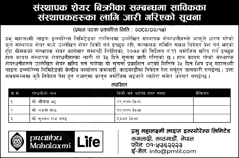 काठमाडौं । प्रभु महालक्ष्मी लाइफ इन्स्योरेन्स कम्पनी लिमिटेडले ३५ हजार ६७४ कित्ता संस्थापक शेयर बिक्रीमा राखेको छ।