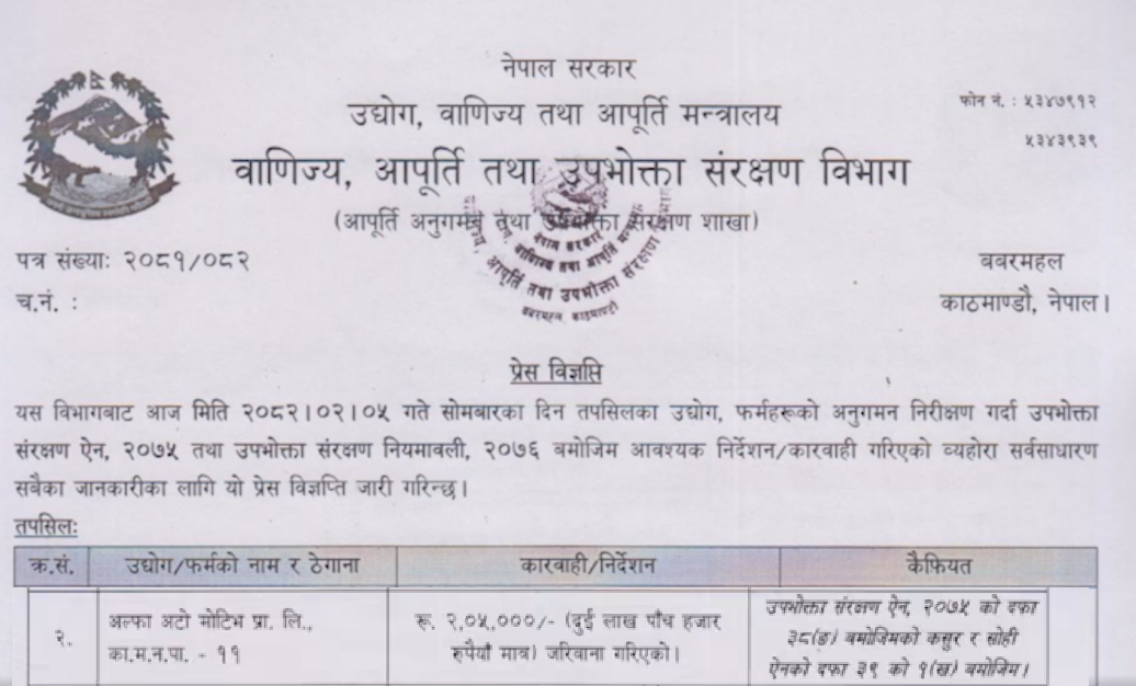 कम्पनीको नियोजित रणनीतिले उपभोक्ताको विश्वास, पैसा र जीवनसमेत जोखिममा परेको तथ्यहरू एकपछि अर्को गर्दै सार्वजनिक भइरहेका छन् । नेपालका लागि रोयल इन्फिल्ड मोटरसाइकलको आधिकारिक बिक्रेता ’अल्फा अटोमोटिभ प्रालि’ र यसको एसेम्बली साझेदार ’टीजी अटो ग्रुप’ले गरिरहेको व्यापारिक गतिविधि हेर्दा यो व्यापारभन्दा बढी नियोजित उपभोक्ता शोषणको एउटा उदाहरण हो भन्नेमा अब कुनै शंका बाँकी छैन । हालै वाणिज्य, आपूर्ति तथा उपभोक्ता संरक्षण विभागले गरेको निरीक्षणले पनि यही यथार्थ उजागर गरेको छ । विभागले काठमाडौं–११ स्थित अल्फा अटोमोटिभ प्रालिमा छापा मार्दा उपभोक्तालाई धोका दिने कार्यहरू प्रमाणसहित फेला पारेपछि २ लाख ५ हजार रुपैयाँ जरिवाना गरेको छ । उपभोक्ता संरक्षण ऐन २०७५ को दफा ३८ (ङ) को कसुर र सोही ऐनको दफा ३९ को १ (ख) बमोजिम कारबाही गरिएको जनाएको छ ।