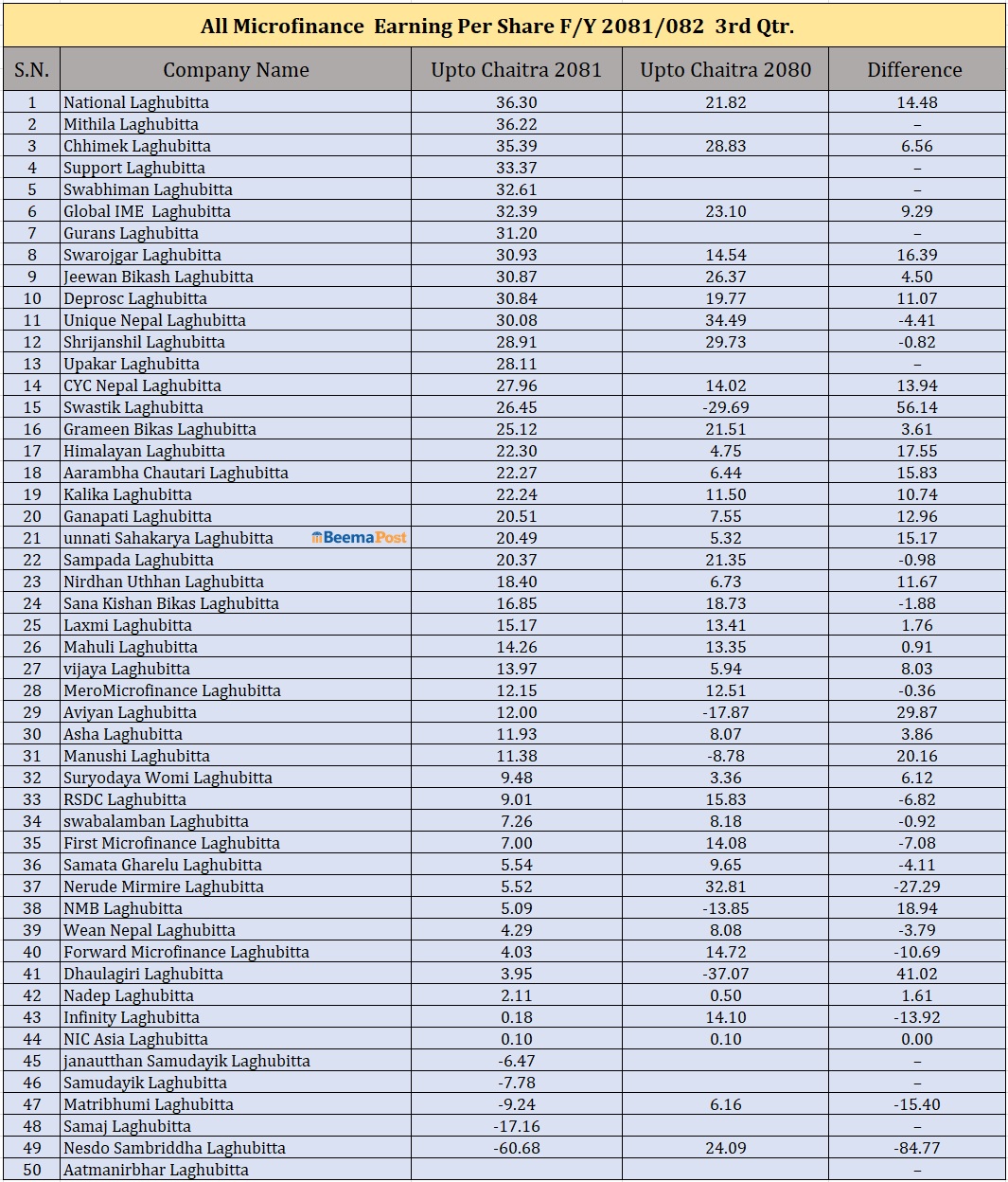 वित्तीय विवरण सार्वजनिक गरेका लघुवित्त संस्थाहरुमध्ये नेशनल लघुवित्तको प्रतिशेयर आम्दानी सबैभन्दा माथि रहेको छ । कम्पनीको प्रतिशेयर आम्दानी ३६ रुपैयाँ ३० पैसा रहेको छ । त्यस्तै मिथिला लघुवित्तको ईपीएस ३६ रुपैयाँ २२ पैसा रहेको छ भने छिमेक लघुवित्तको ३५ रुपैयाँ ३९ पैसा र सपोर्ट लघुवित्तको ३३ रुपैयाँ ३७ पैसा रहेको छ ।