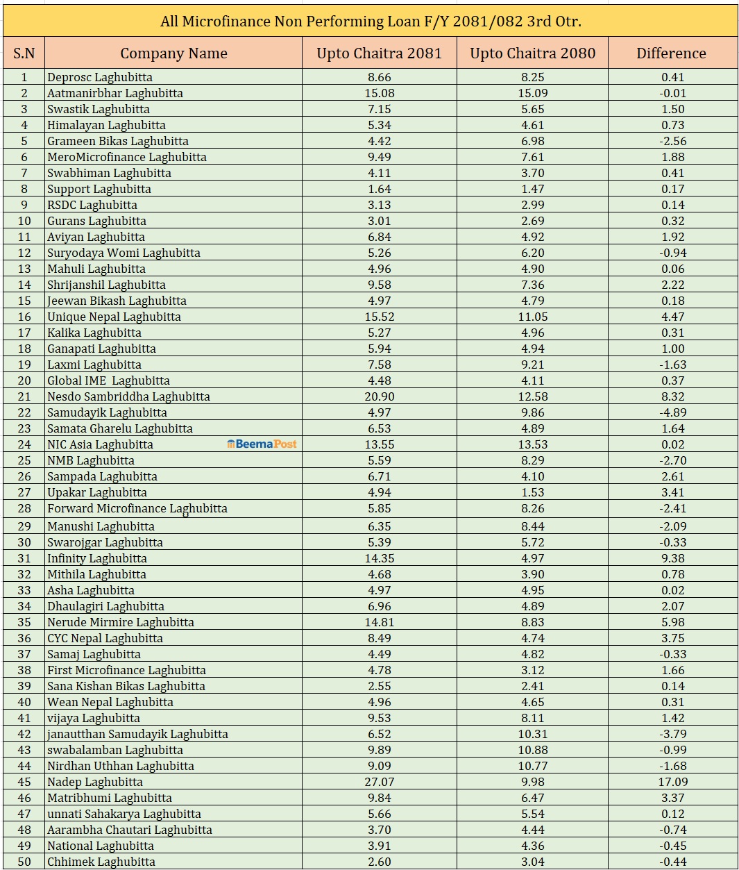 साथै, गुराँस लघुवित्तको ३.०१ प्रतिशत, आरएसडिसी लघुवित्तको ३.१३ प्रतिशत, स्वाभिमान लघुवित्तको ४.११ प्रतिशत, ग्रामिण विकास लघुवित्तको ४.४२ प्रतिशत, हिमालयन लघुवित्तको ५.३४ प्रतिशत, स्वस्तिक लघुवित्तको ७.१५ प्रतिशत, डिप्रोक्स लघुवित्तको ८.६६ प्रतिशत खराब कर्जा रहेको छ । दोस्रो बजारमा सबैभन्दाबढी शेयरमूल्य रहेको आत्मनिर्भर लघुवित्तको खराब कर्जा १५ प्रतिशत रहेको छ ।