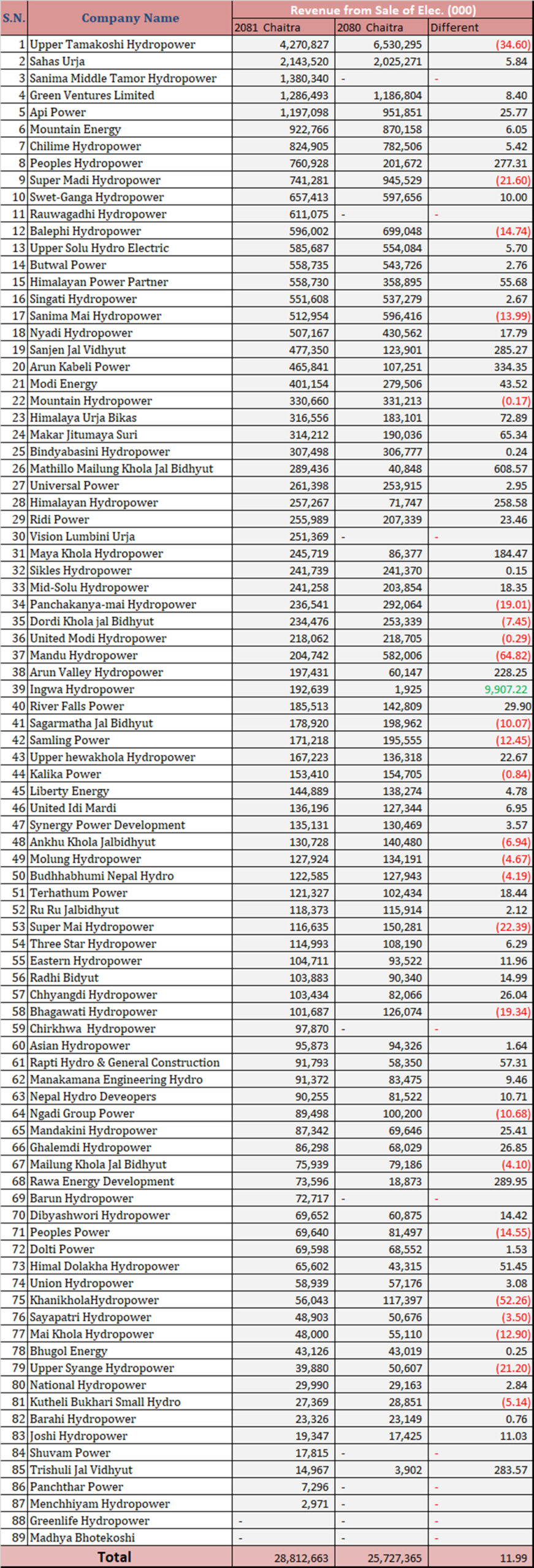 सूचीकृत हाइड्रोपावरमध्ये ५४ वटा कम्पनीको विद्युत बिक्री आम्दानी वृद्धि भएको छ । तर, २५ वटा भने केही घटेको छ । केही हाइड्रोपावर कम्पनीले यो वर्षदेखि उत्पादन थालनी गरेका छन् ।