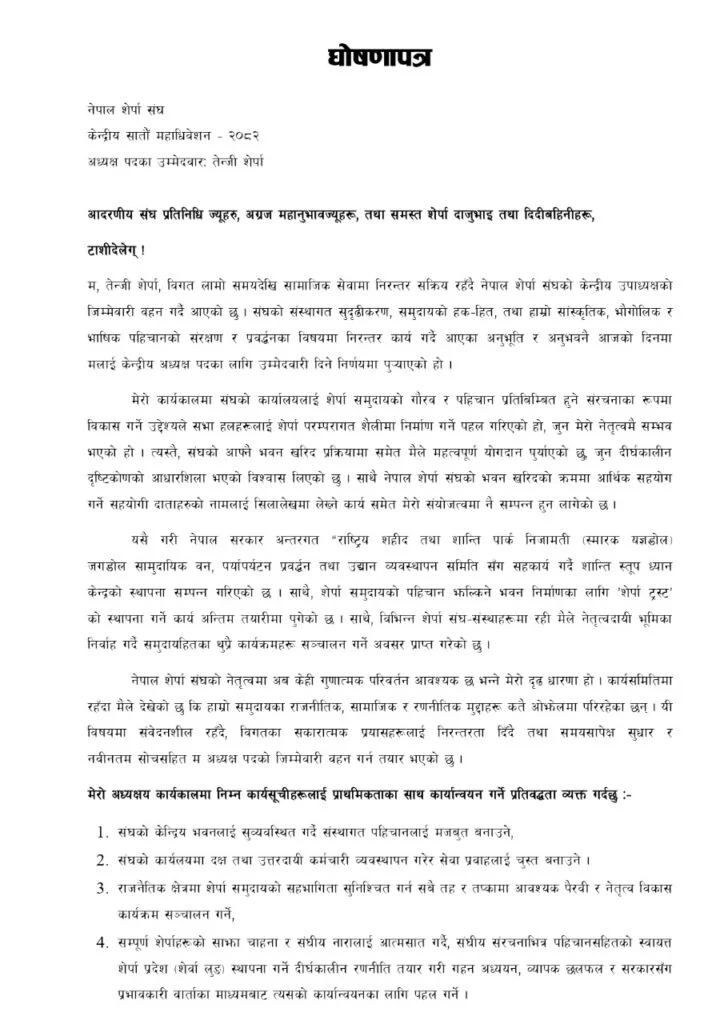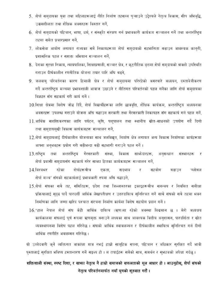 उनले आफू कुनै विशेष गुट वा समूहको समर्थनमा नभई सम्पूर्ण शेर्पा समुदायको हितका लागि स्वतन्त्र रूपमा अघि बढेको स्पष्ट पारेका छन्। “यो उम्मेदवारी व्यक्तिगत आकांक्षा होइन, सम्पूर्ण समुदायको अधिकार र भविष्यलाई संस्थागत बनाउने प्रयास हो,” उनले भने।