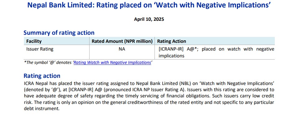 हालसम्म नेपाल बैंकलाई दिइएको “ए” श्रेणीको रेटिङ अब ‘निगरानीमा’ राखिएको छ, जसको अर्थ बैंकको आर्थिक स्थायित्वप्रति शंका पैदा भएको हो। यस्ता रेटिङले संस्थाको वित्तीय दायित्व समयमै तिर्ने क्षमतामा अब पूर्ण विश्वास गर्न सकिँदैन भन्ने सन्देश दिन्छ।