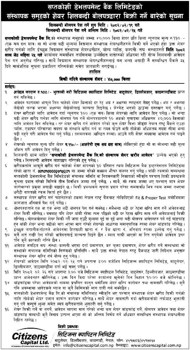 काठमाडौं । सप्तकोशी डेभलपमेन्ट बैंकले ४० हजार कित्ता संस्थापक शेयर सबैले किन्न पाउने गरी लिलाम मार्फत् बिक्रीमा राखेको छ।