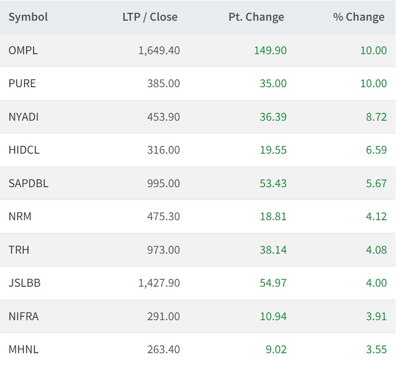 यसका अलवा न्यादी हाइड्रोपावर, एचआईडीसीएल, सप्तकोशी विकास बैंक, नेपाल रिपब्लिक मिडिया र तारागाउँ रिजेन्सी होटलको शेयरमूल्य सर्वाधिक बढेको छ।