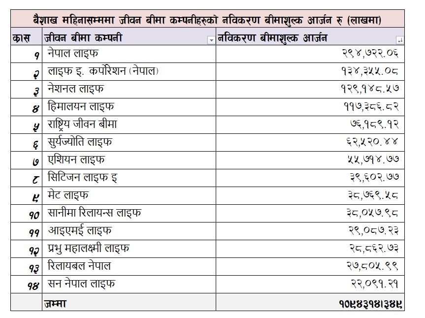 जीवन बीमा कम्पनीहरुको नविकरण बीमाशुल्क १ खर्बमाथि (सूची सहित)