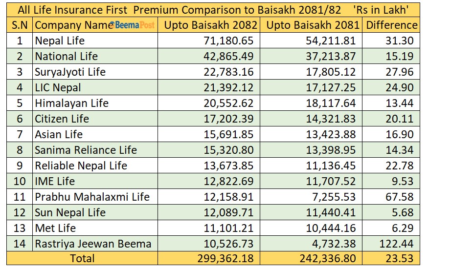 त्यस्तै, सूर्य ज्योति लाइफले २ अर्ब ५ करोड रुपैैयाँ, हिमालयन लाइफले १ अर्ब ९२ करोड रुपैयाँ, सिटिजन लाइफले १ अर्ब ५४ करोड रुपैयाँ, एशियन लाइफले १ अर्ब ३९ करोड रुपैयाँ, सानिमा रिलायन्स लाइफले १ अर्ब ३३ करोड रुपैयाँ, रिलायबल नेपाल लाइफले १ अर्ब १८ करोड रुपैयाँ, मेट लाइफले १ अर्ब ११ करोड रुपैयाँ, प्रभु महालक्ष्मी लाइफले १ अर्ब ७ करोड रुपैयाा आइएमई लाइफले १ अर्ब ३ करोड रुपैयाँ, राष्ट्रिय जीवन बीमा कम्पनीले ९२ करोड रुपैयाँ र सन नेपााल लाइफले ८० करोड ५३ लाख रुपैयाँ प्रथम बीमाशुल्क आर्जन गर्न सफल भएका छन् ।