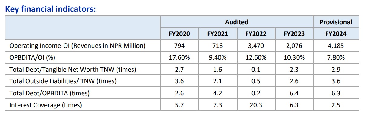 ऋणबाट सञ्चालन नाफा निकाल्ने क्षमता सन् २०२३ मा ६.४ गुणा रहेकोमा सन् २०२४ मा ६.३ गुणा देखिएको छ । ब्याज तिर्ने क्षमता भने सन् २०२३ मा ६.२ गुणा रहेकोमा सन् २०२४ मा घटेर २.५ गुणा पुगेको छ । ऋण सेवा कवरेज अनुपात ५.१ बाट झरेर १.९ मा आइपुगेको छ भने तरलता सूचक सन् २०२४ मा १.२ मा पुगेको छ।