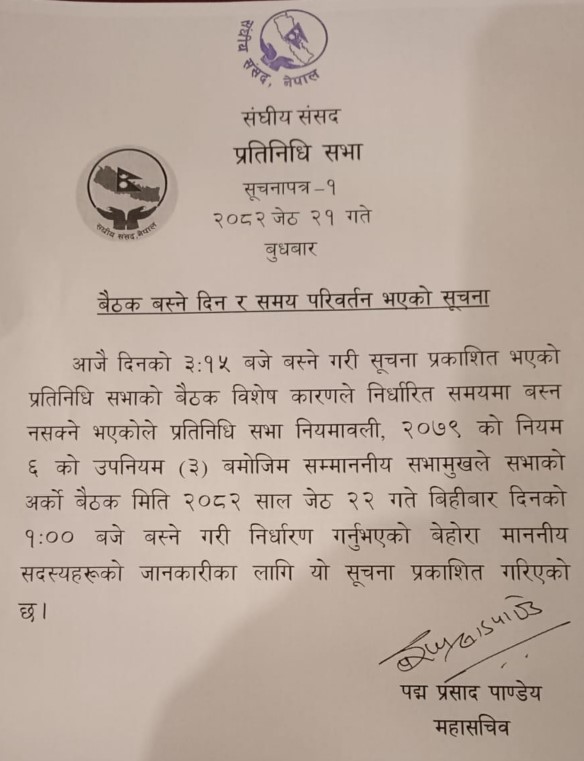प्रतिनिधि सभा बैठक स्थगित, बिहीबार दिउँसो १ बजे बस्ने