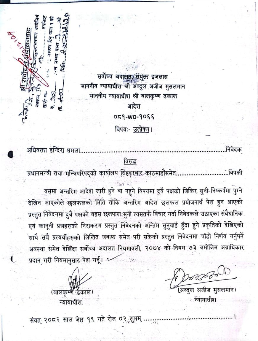 आदेशमा भनिएको छ – प्रस्तुत निवेदनमा चाँडो निर्णय गर्नुपर्ने अवस्था समेत देखिँदा सर्वोच्च अदालत नियमावली २०७४ को नियम ७३ बमोजिम अग्राधिकार प्रदान गरी नियमानुसार पेस गर्नु ।