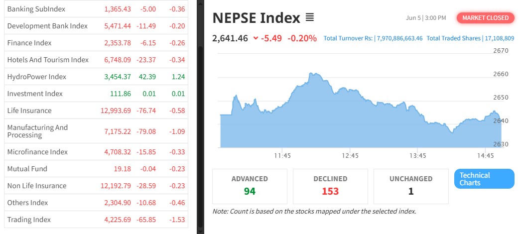 नेपाल स्टक एक्सचेञ्ज (नेप्सें) ५.४९ अकंले घटेर २६४१.४६ बिन्दुमा कायम भएको छ । आज ३११ कम्पनीको १ करोड ७१ लाख ८ हजार कित्ता शेयर किनबेच हुँदा ७ अर्ब ९७ करोड ८ लाख रुपैयाँको कारोबार भएको छ ।