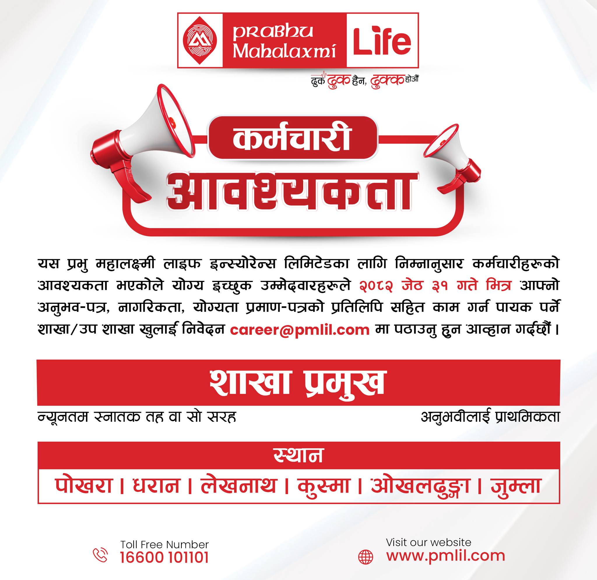 प्रभु महालक्ष्मी लाइफद्वारा विभिन्न स्थानमा शाखा प्रमुख माग (सूचनासहित)