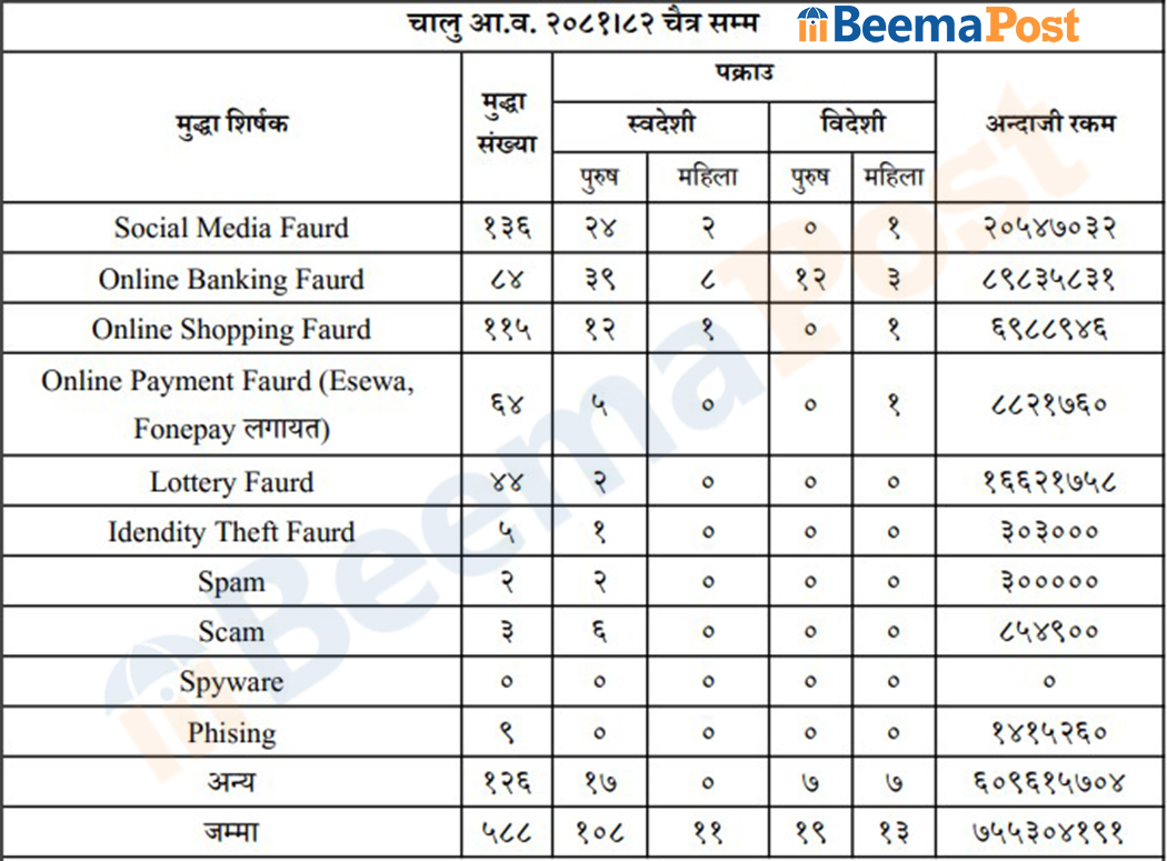 लट्री देखाएर १ करोड ६६ लाख २१ हजार रूपैयाँ, पहिचान चोरी गरी ३ लाख ३ हजार, स्पाम (अनावश्यक वा झूटा सूचना पठाउने) गरी ३ लाख र स्क्याम (छलपूर्ण योजना) गरी ८ लाख ५४ हजार, फिसिङ (झुटो वेबसाइट वा सन्देशमार्फत गोप्य जानकारी चोर्ने) गरी १४ लाख १५ हजार रुपैयाँ गठी भएको छ । यसैगरी अन्य प्रकारका ठगीसम्बन्धी १२६ वटा मुद्दा दर्ता भएका छन् । यसमध्ये १७ जना स्वदेशी पक्राउ परेका छन् भने १४ जना विदेशी पक्राउ परेका छन् । जस मार्फत ६० करोड ९६ लाख १५ हजार रूपैयाँ ठगी भएको छ ।