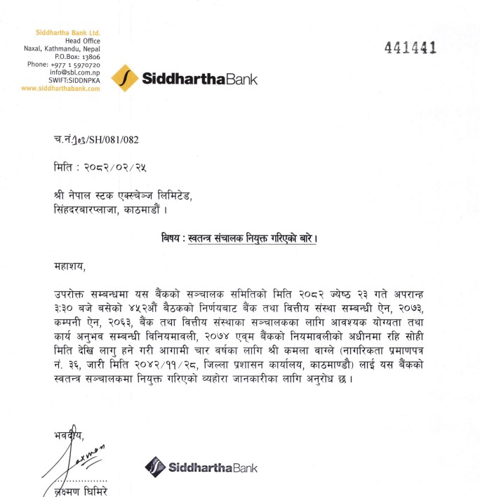 काठमाडौं । सिद्धार्थ बैंकको स्वतन्त्र सञ्चालकमा कमला वाग्ले नियुक्त भएकी छिन् ।