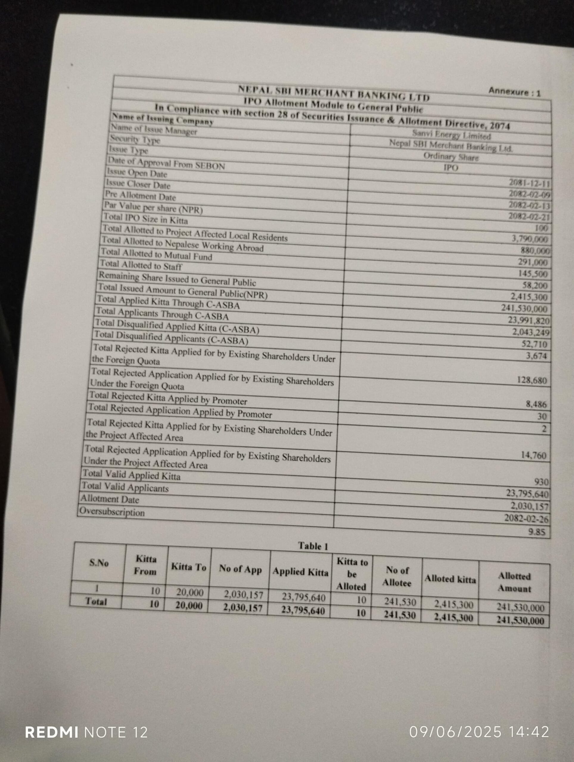 कम्पनीले आज सार्नजनिक गरेको आईपीओमा कुल २० लाख ४३ हजार २ सय ४९ जनाले २ करोड ३९ लाख ९१ हजार ८ सय २० कित्ताको लागि आवेदन दिएका थिए । जस मध्ये २० लाख ३० हजार १ सय ५७ जनाको आवेदनले मात्रै आइपीओ पाएकबा छन् ।