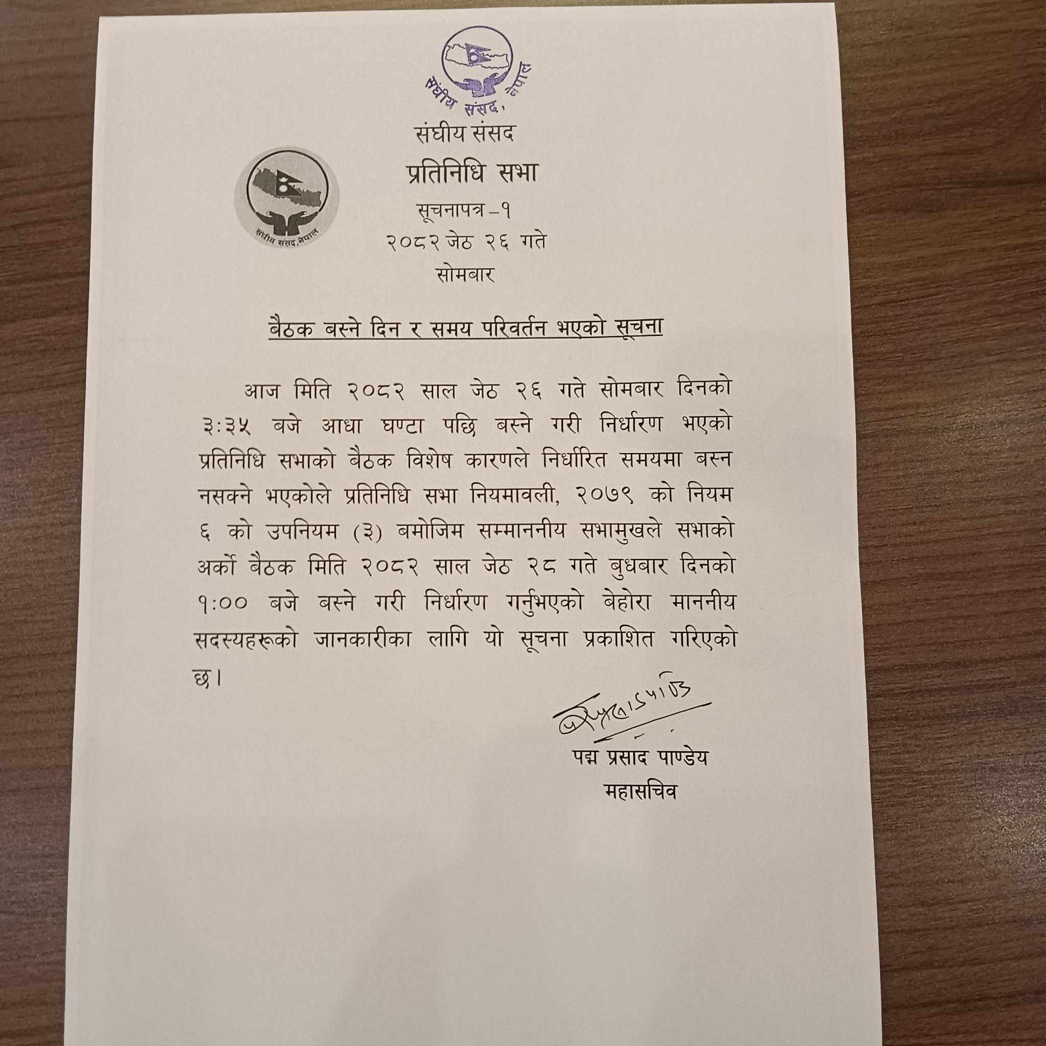 प्रतिनिधिसभा बैठक अब बुधबार बस्ने