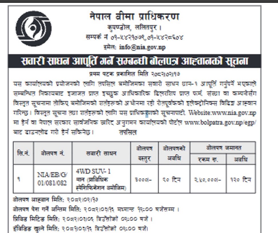 काठमाडौं । नेपाल बीमा प्राधिकणले महंगो मोटर गाडी खरिद गर्ने भएको छ । प्राधिकरणले बोलकबोल मार्फत उक्त गाडी खरिदका लागि आपुर्तीकर्ता सँग सिलबन्दी डेण्टर आह्वान गरेको हो ।