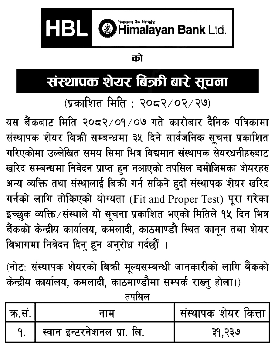 काठमाडौं । हिमालयन बैंक लिमिटेडले ३१ हजार २३७ कित्ता संस्थापक शेयर सर्वसाधारणका लागि बिक्रीमा राखेको छ।