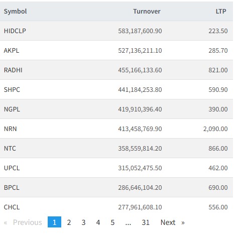 त्यस्तै, अरुण काबेली, राद्यी विधुत्, सानिमा माई, नाग्दी गुप्र, एनआरएन इन्फ्रास्क्चर, नेपाल टेलिकम, यु्निभर्सल पावर, बुटवल पावर र चिलिमे हाईड्रोपावरको सर्वाधिक कारोबार भएको छ।