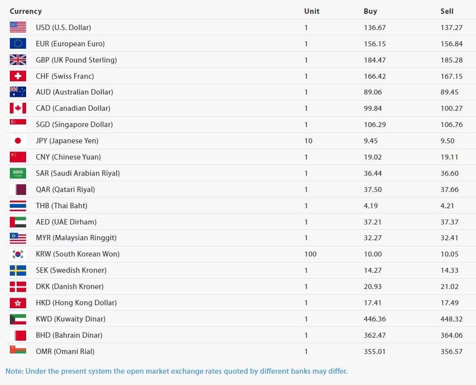 जापानी येन १० को खरीददर ९.४५ रुपैयाँ र बिक्रीदर ९.५० रुपैयाँ, चिनियाँ युआन एकको खरीददर १९.०२ रुपैयाँ र बिक्रीदर १९.११ रुपैयाँ, साउदी अरेबियन रियाल एकको खरीददर ३६.४४ रुपैयाँ र बिक्रीदर ३६.६० रुपैयाँ, कतारी रियाल एकको खरीददर ३७.५० रुपैयाँ र बिक्रीदर ३७.६६ रुपैयाँ कायम गरिएको छ।