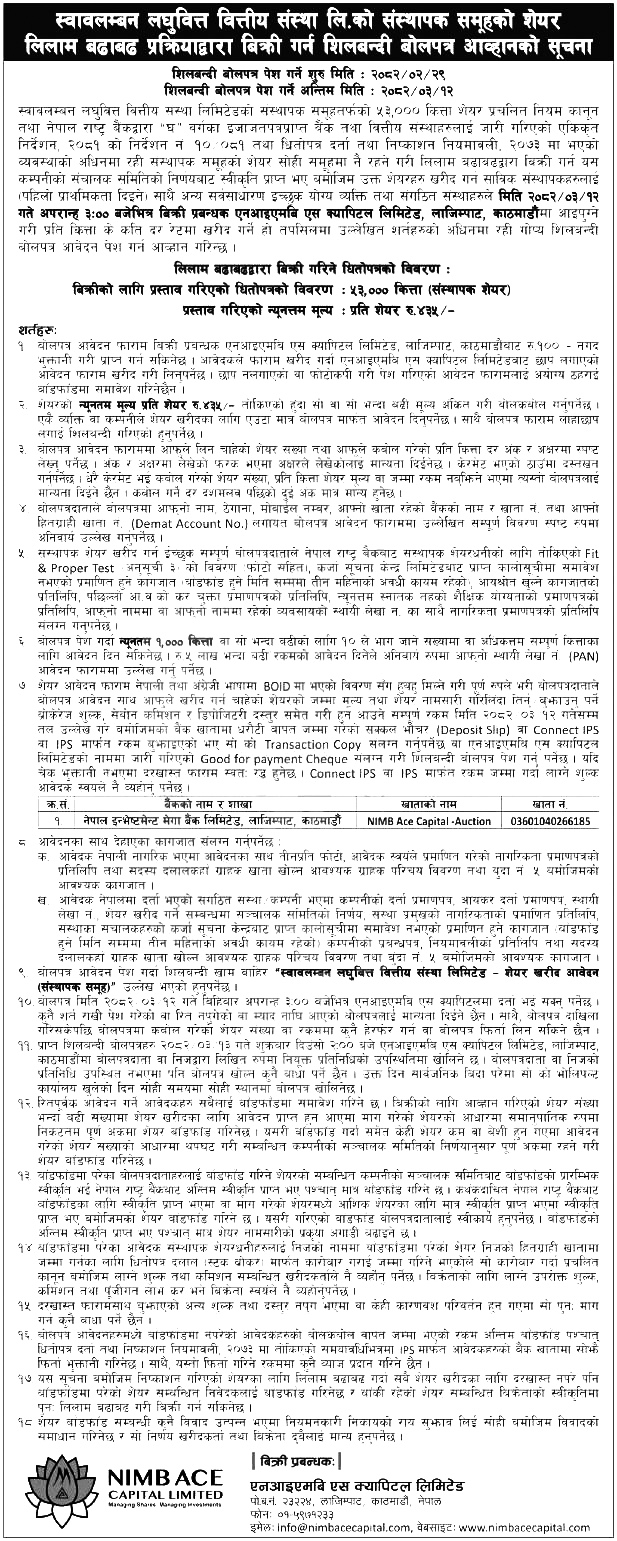 काठमाडौं । स्वावलम्बन लघुवित्त वित्तीय संस्था लिमिटेडले ५३ हजार कित्ता संस्थापक शेयर लिलाम प्रक्रियाद्वारा बिक्रीमा राखेको छ।