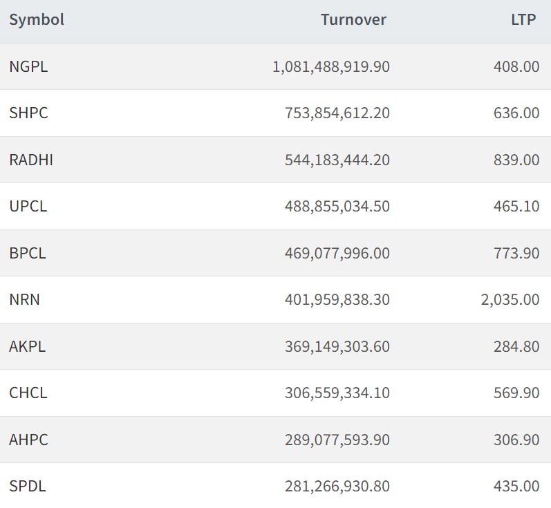 सानिमा माइ हाइड्रोको ७५ करोड ३८ लाख रुपैयाँ, राधी विद्युतको ५४ करोड ४१ लाख रुपैयाँ, युनिभर्सल पावरको ४८ करोड ८८ लाख रुपैयाँ, बुटवल पावर कम्पनीको ४६ करोड ९० लाख रुपैयाँको शेयर कारोबार भएको छ।