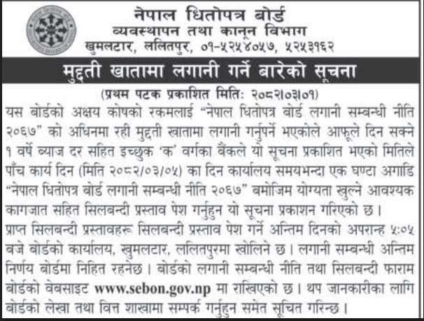 बोर्डले असार ५ गतेको कार्यालय समयभन्दा एक घण्टा अगाडि सिलबन्दी प्रस्ताव पेश गर्न आह्वान गरेको छ। प्रस्ताव पेश गर्दा एक वर्षे मुद्दती खातामा दिन सकिने ब्याज दर तथा लगानी सम्बन्धी नीतिअनुसार योग्यता खुल्ने कागजात संलग्न गर्नु पर्नेछ।