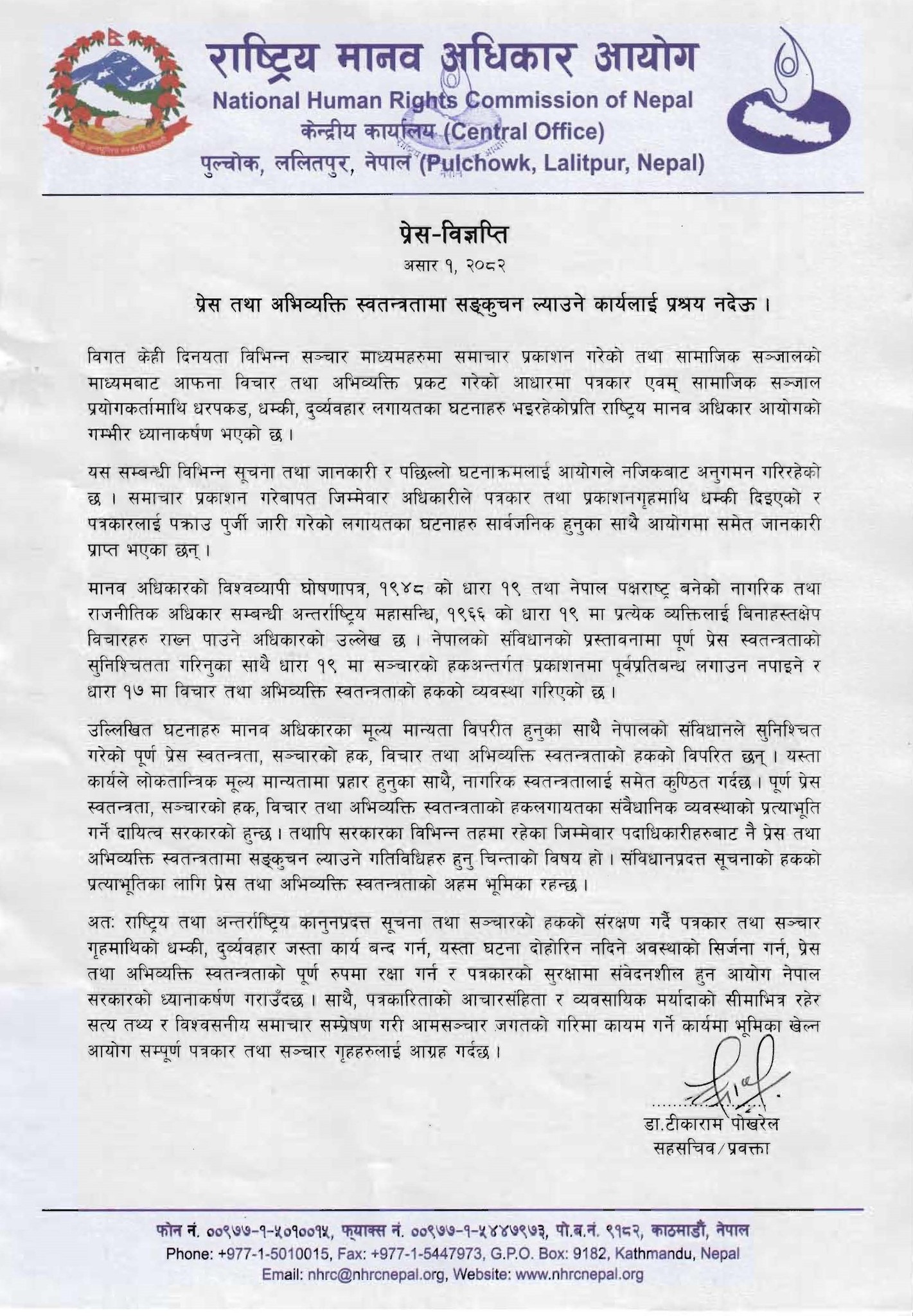 आयोगले पछिल्लो घटनाक्रम तथा प्राप्त सूचनालाई नजिकबाट अनुगमन गरिरहेको जानकारी दिँदै यस्ता गतिविधि प्रेस स्वतन्त्रता, विचार तथा अभिव्यक्ति स्वतन्त्रता र सञ्चारको हकजस्ता संवैधानिक तथा मानव अधिकार सम्बन्धी कानुनी प्रावधानको उल्लङ्घन भएको ठहर गरेको छ ।