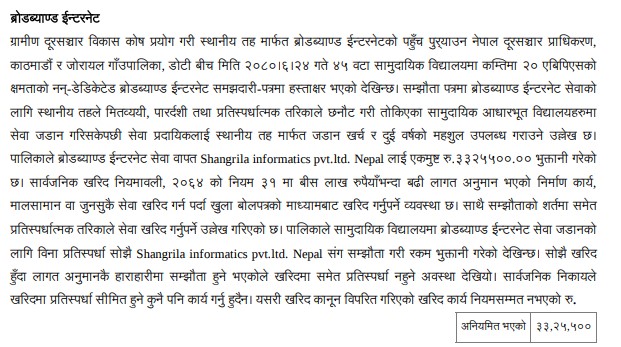 तर पालिकाले सो प्रावधानको पालना नगरी सांग्रिला इन्फर्मेटिक्स प्रा.लि. नेपालसँग सोझै सम्झौता गरी एकमुष्ट ३३ लाख २५ हजार ५ सय रुपैयाँ भुक्तानी गरेको देखिएको छ। प्रतिवेदनमा भनिएको छ, ‘सम्झौताका शर्तमा समेत प्रतिस्पर्धात्मक तरिकाले सेवा खरिद गर्नुपर्ने उल्लेख छ। तर पालिकाले विना प्रतिस्पर्धा सेवा खरिद गरेको देखिन्छ।’
