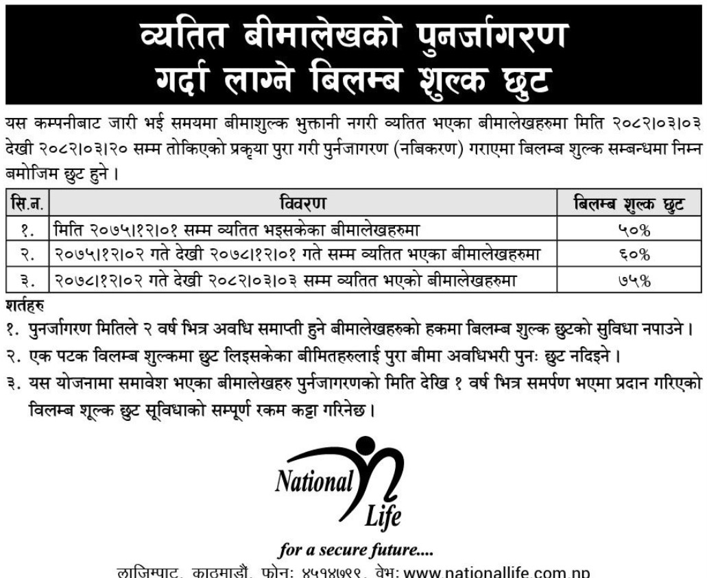 नेशनल लाइफको व्यतित बीमालेखमा पुनर्जागरणमा बिलम्ब शुल्कमा छुट, कस्तो अवस्था यो सुविधा पाईदैन ?