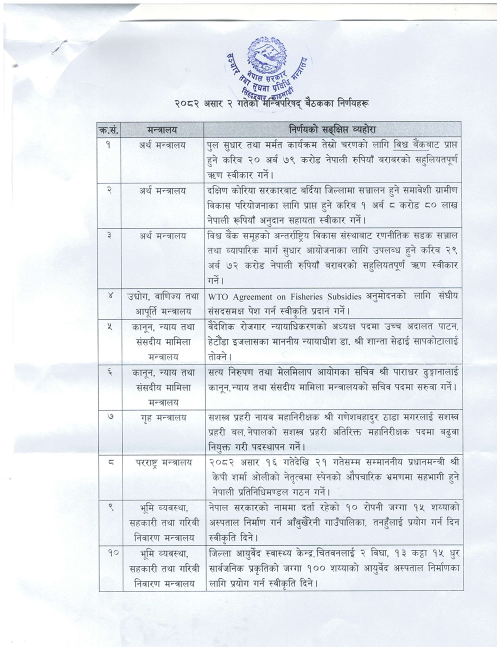यस्ता छन् मन्त्रिपरिषद् बैठकले गरेका १९ निर्णय (सूचीसहित)