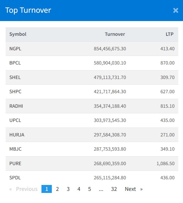 बिहीबार ङादी ग्रुप पावरको ८५ करोड ४४ लाख रुपैयाँ, बुटवल पावर कम्पनीको ५८ करोड नौ लाख रुपैयाँ, सिंगटी हाइड्रो इनर्जीको ४७ करोड ९१ लख रुपैयाँ, सानिमा माइ हाइड्रोपावरको ४२ करोड १७ लाख रुपैयाँको सर्वाधिक कारोबार भएको छ ।