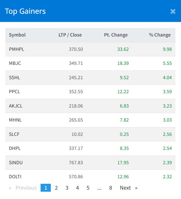 त्यस्तै, मध्य भोटेकोशी जलविद्युतको ५.५५ प्रतिशत, शिव श्री हाइड्रोपावरको ४.०४ प्रतिशत, पाँचथर पावर कम्पनीको ३.५९ प्रतिशतले शेयरमूल्य बृद्धि भएको छ ।