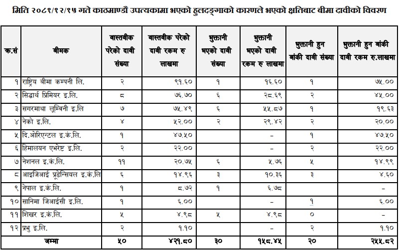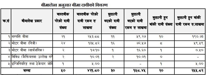 जसमध्ये घर तथा भवन तोडफोड र आगजनी बापत सम्पत्ति बीमाको मात्रै २१ वटा दाबी निवेदन बापत २ करोड ५३ लाख ८८ हजार दाबी माग भएको छ। त्यस्तै निजी मोटरमा तोडफोड र आगजनी गरेकोमा २४ वटा निवेदन बापत १ करोड ३५ लाख ८२ हजार रुपैयाँको दाबी माग भएको छ।