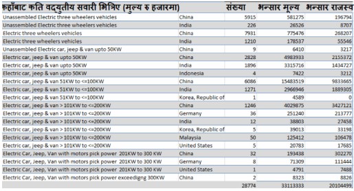 ३३ अर्ब रुपैयाँ भन्सार मूल्यका विद्युतीय सवारी नेपाल भित्रिए, कहाँबाट कति ?